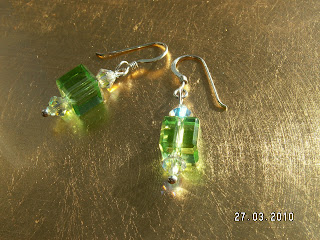 Those earrings are made from green Czech cubes and clear AB Swarovski bicones and Sterling Silver earwires. Perfect for everyday. These earrings would be perfect for Spring!